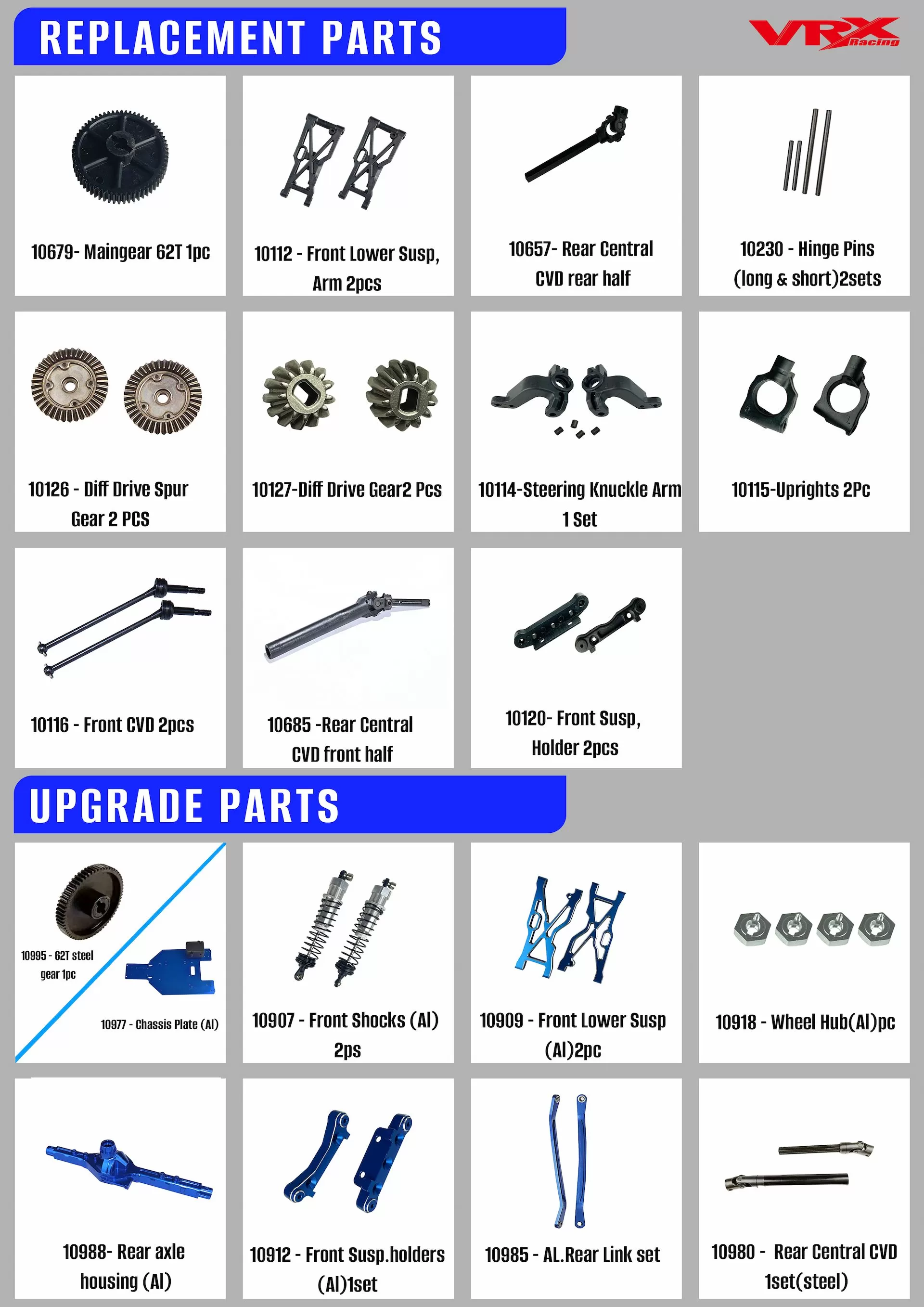 La suspensión totalmente ajustable incluye, caída, inclinación, puntera, distancia entre ejes, etc., al ajustar la suspensión, los jugadores pueden optimizar el rendimiento de su automóvil según las condiciones de la pista y las necesidades de conducción, ajustar la suspensión para adaptarse a varias superficies (e.g., pistas lisas, terreno todoterreno). Absorbe eficazmente los golpes durante los saltos o el terreno accidentado, protegiendo el chasis y la electrónica. Optimiza el contacto de los neumáticos con el suelo para un mejor agarre y tracción.